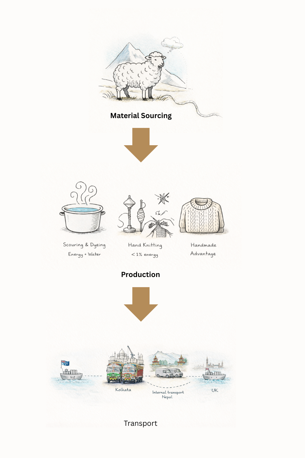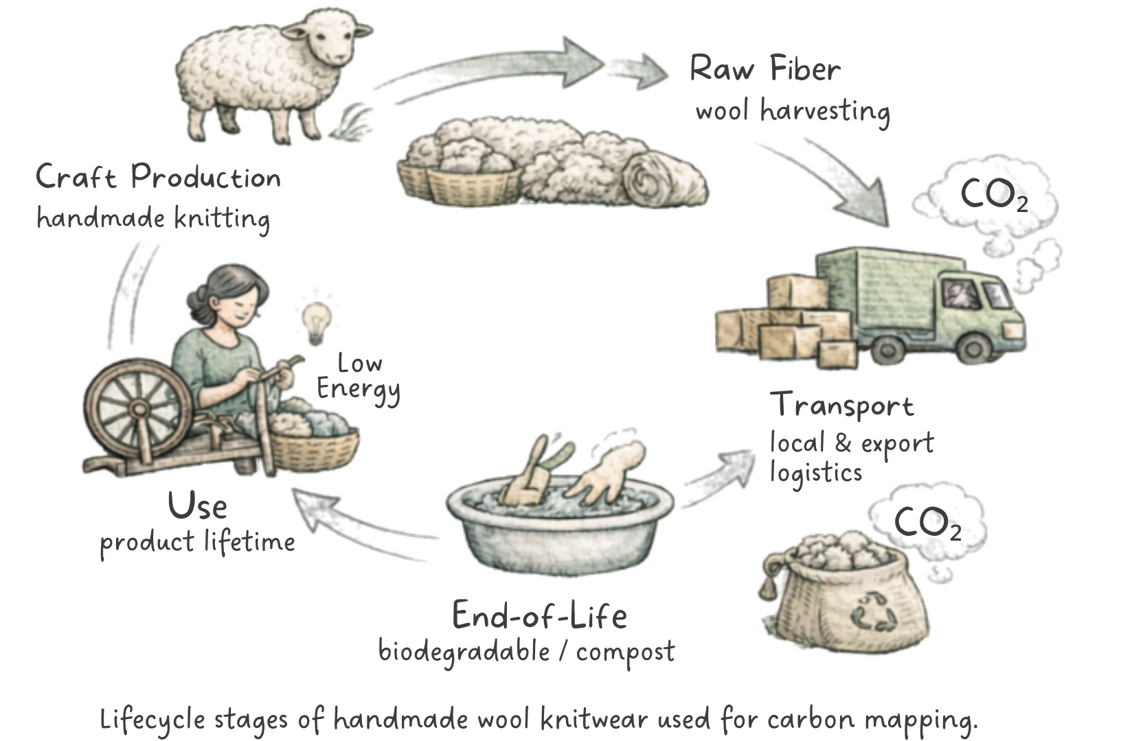 Our LCA study found that most emissions occur during raw material sourcing and transportation, while hand knitting contributes less than 1% of total emissions..